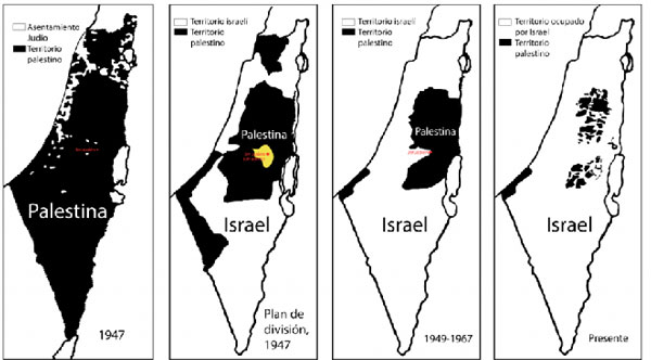 El mapa define claramente la extensión territorial de Israel desde 1947 hasta hoy, aunque la presente invasión de la Franja de Gaza incrementará el territorio de Israel con una parte importante del norte de dicha Franja, o la Franja completa.