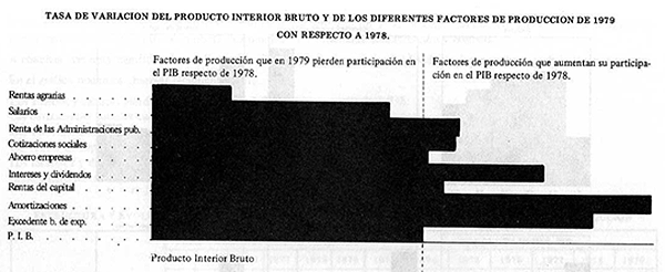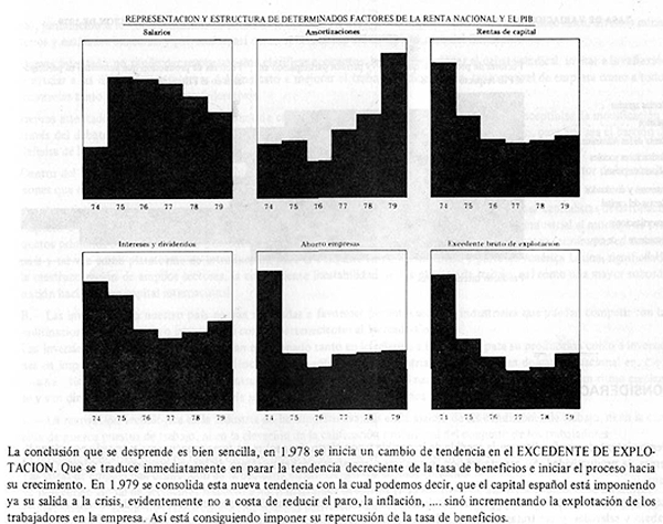 El excedente neto de explotación (término utilizado por la contabilidad nacional para referirse a las rentas de propiedad y de la empresa) pasó del 36% del total de la renta en 1976 al 42% en 1984. Mientras que la remuneración del total de los asalariados pasó del 64% en 1976 al 58% en 1984.