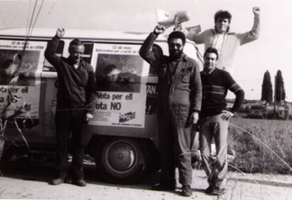 (Vehículo con militantes del Partit dels Comunistes de Catalunya recorriendo barrios y empresas de Catalunya durante la campaña por el NO del referéndum sobre la permanencia en la OTAN. Marzo de 1986)